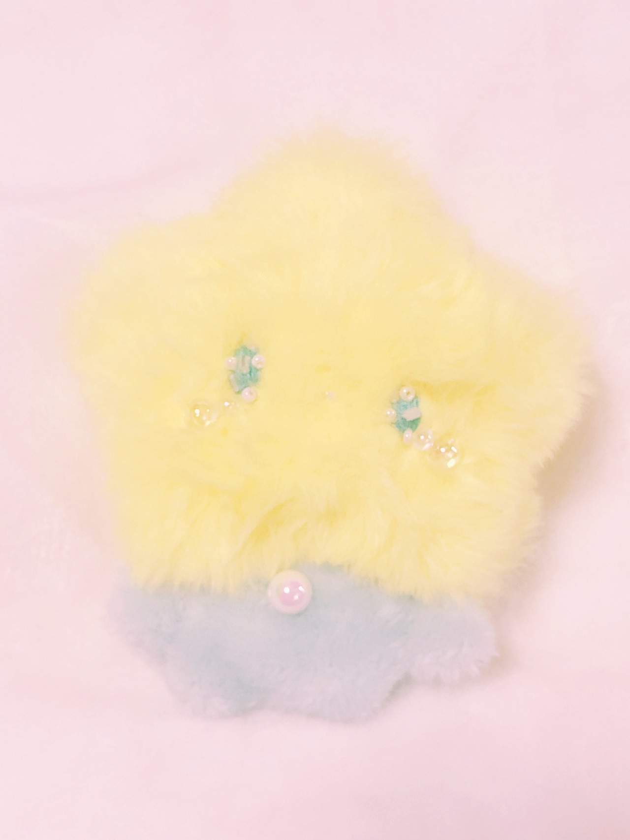 目がキラキラ、ビーズと刺繍でできています。目からはキラリとビーズの涙が光っています。
