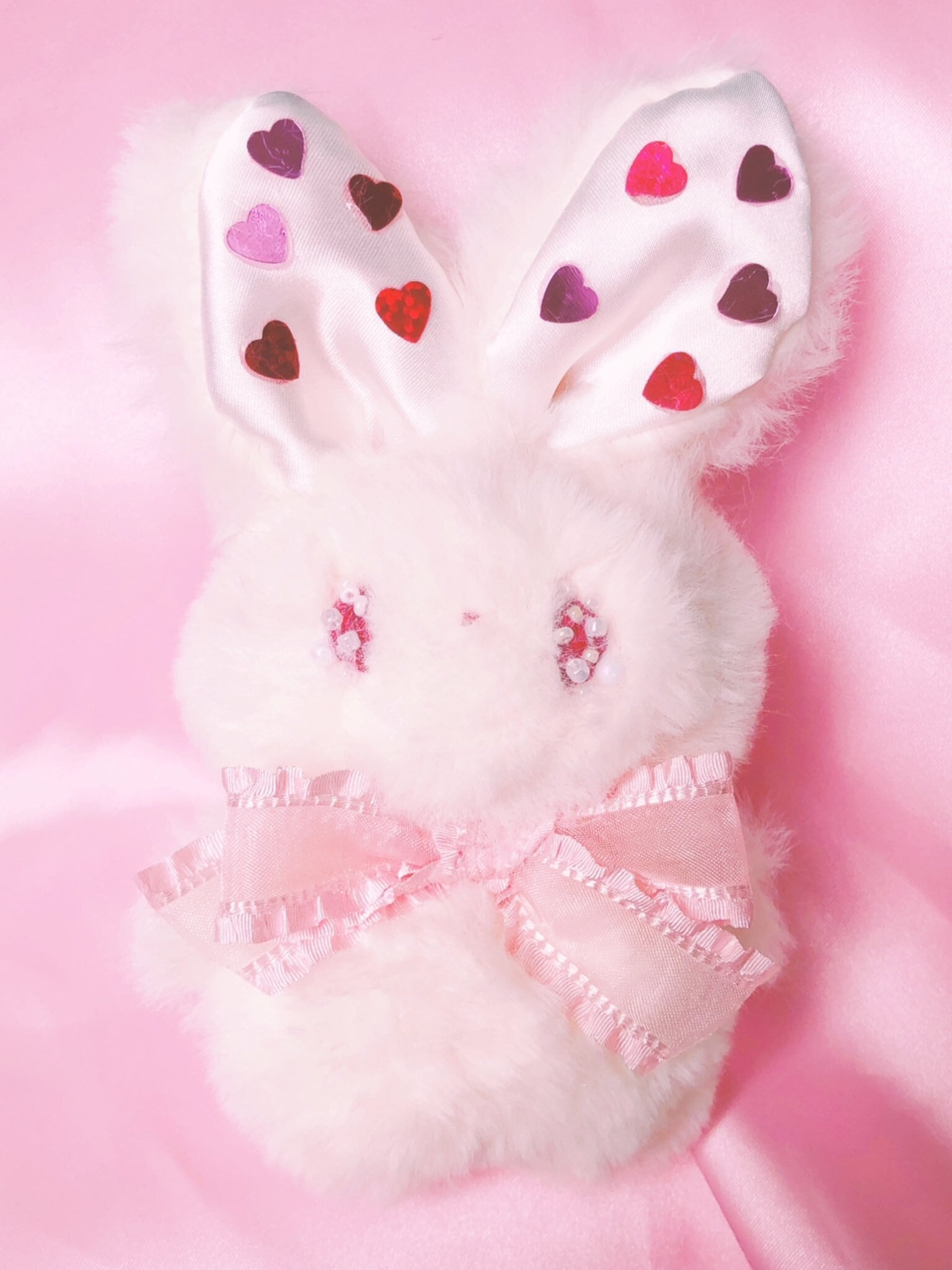 キラキラハートでおしゃれしたうさぎのぬいぐるみです。