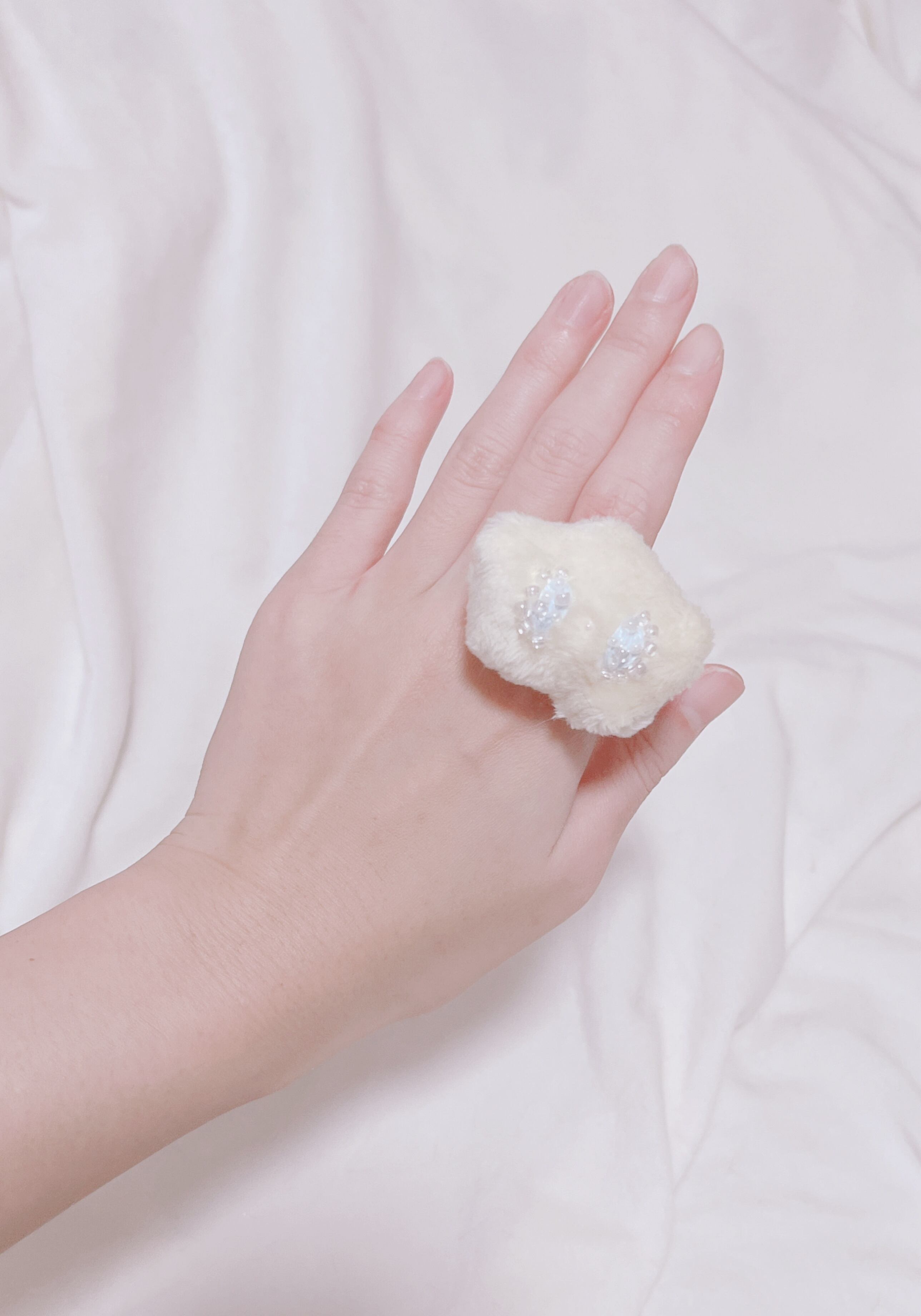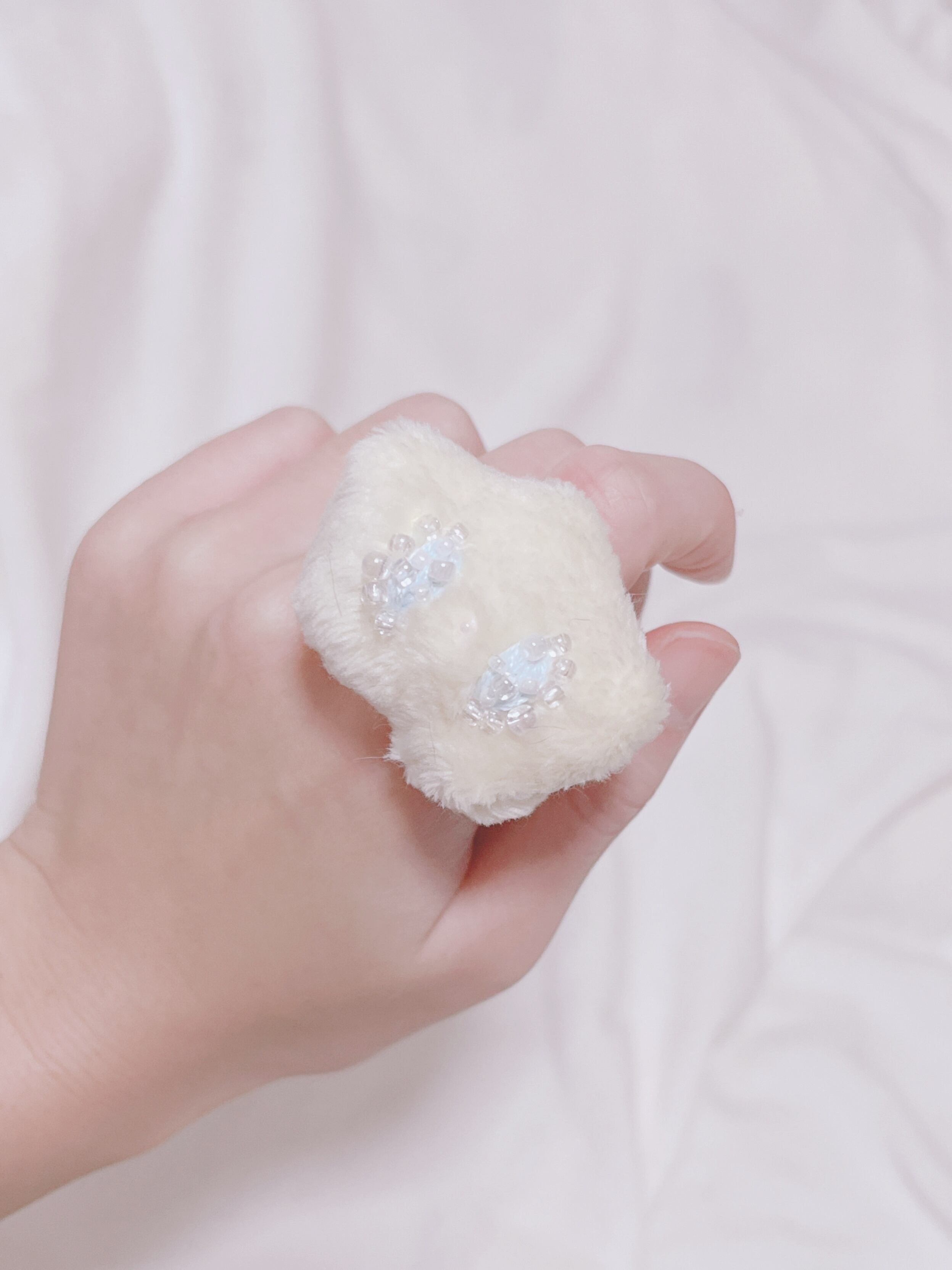 目がキラキラ、ビーズと刺繍でできています。目からはキラリとビーズの涙が光っています。