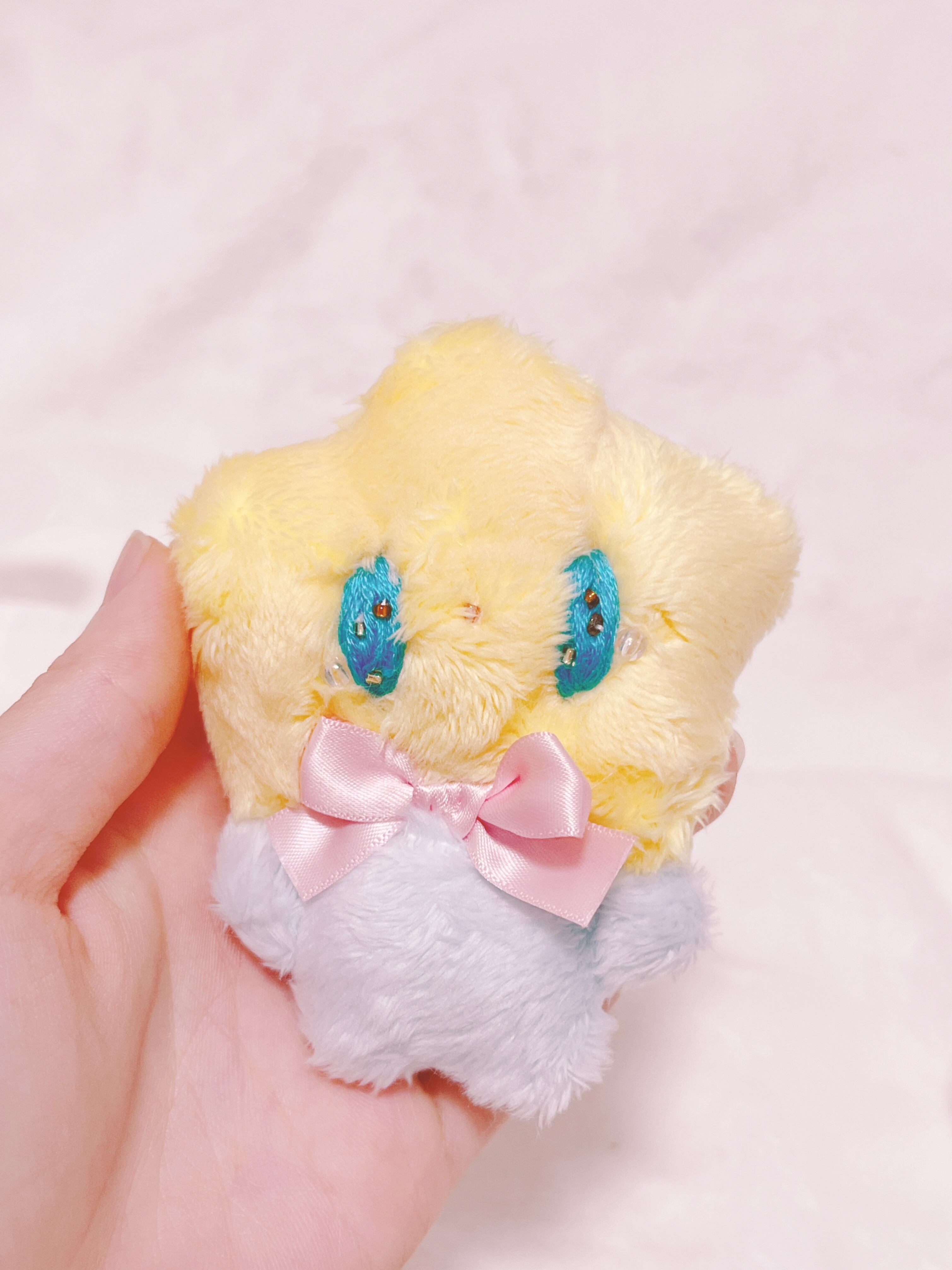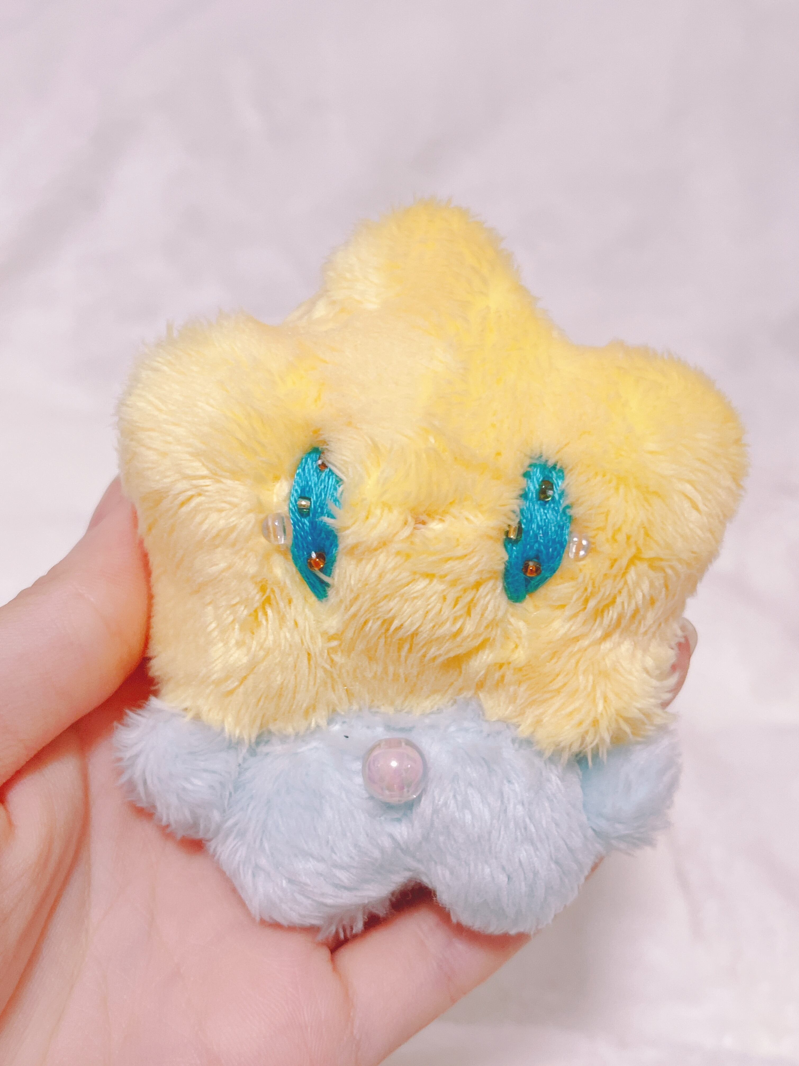 目がキラキラ、ビーズと刺繍でできています。目からはキラリとビーズの涙が光っています。