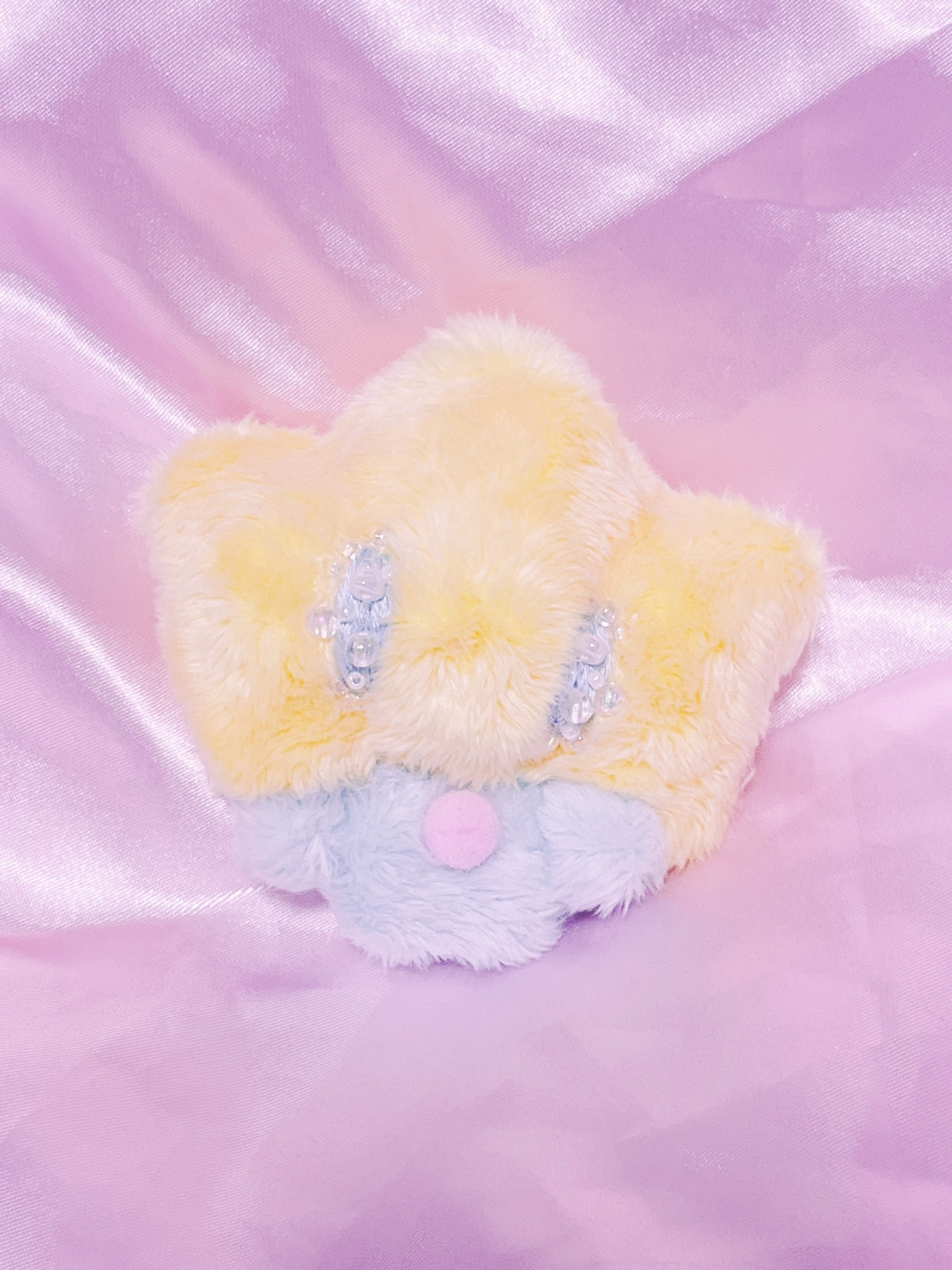 目がキラキラ、ビーズと刺繍でできています。目からはキラリとビーズの涙が光っています。