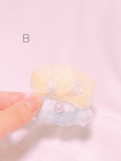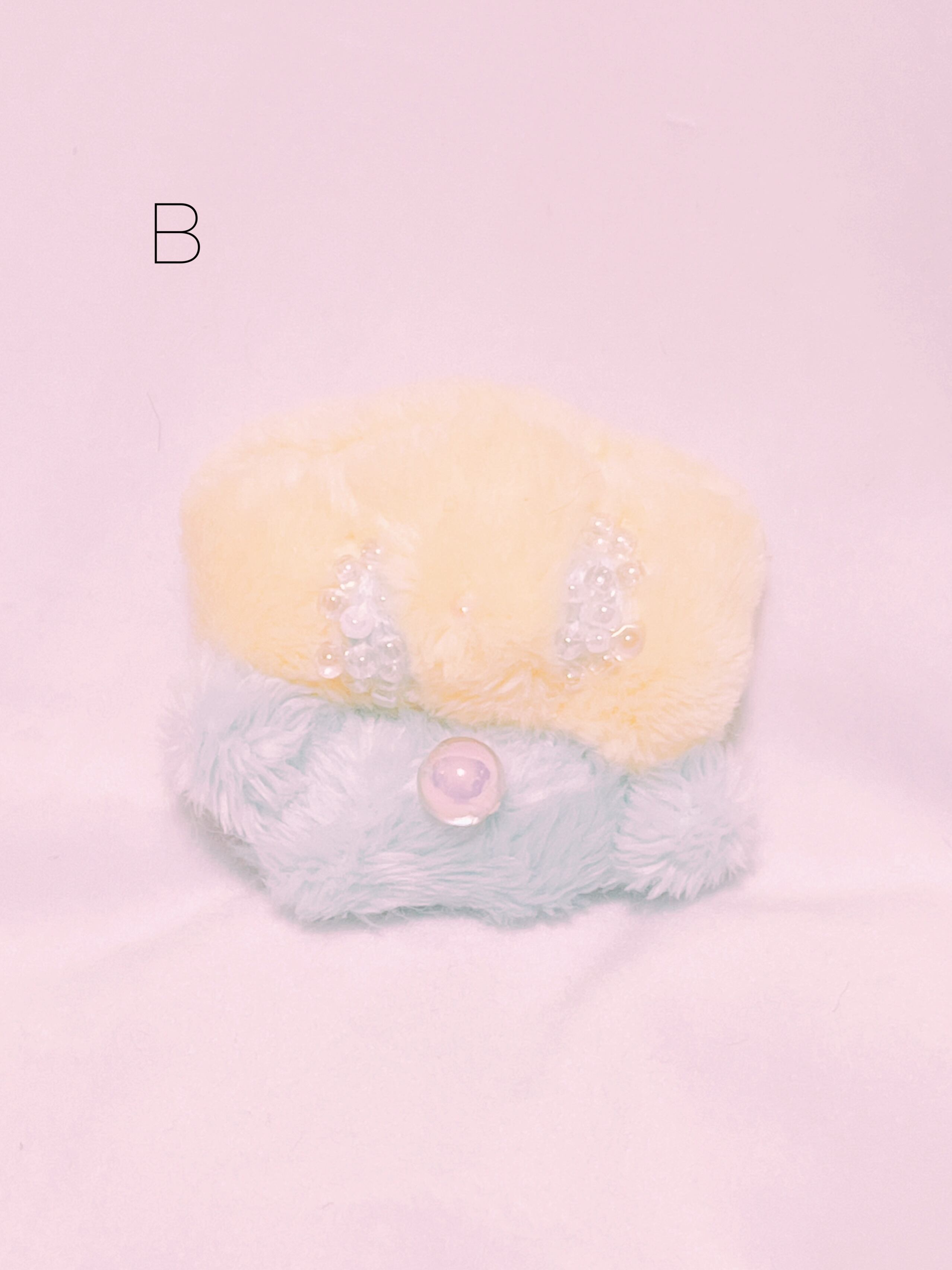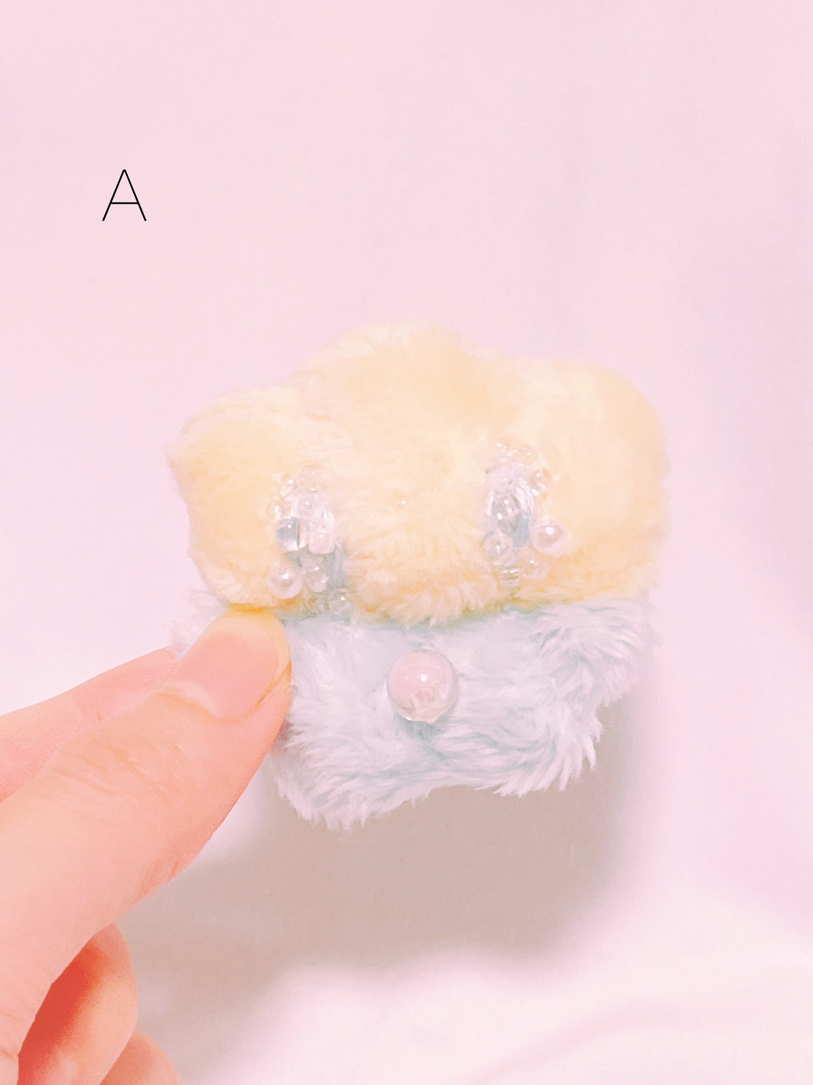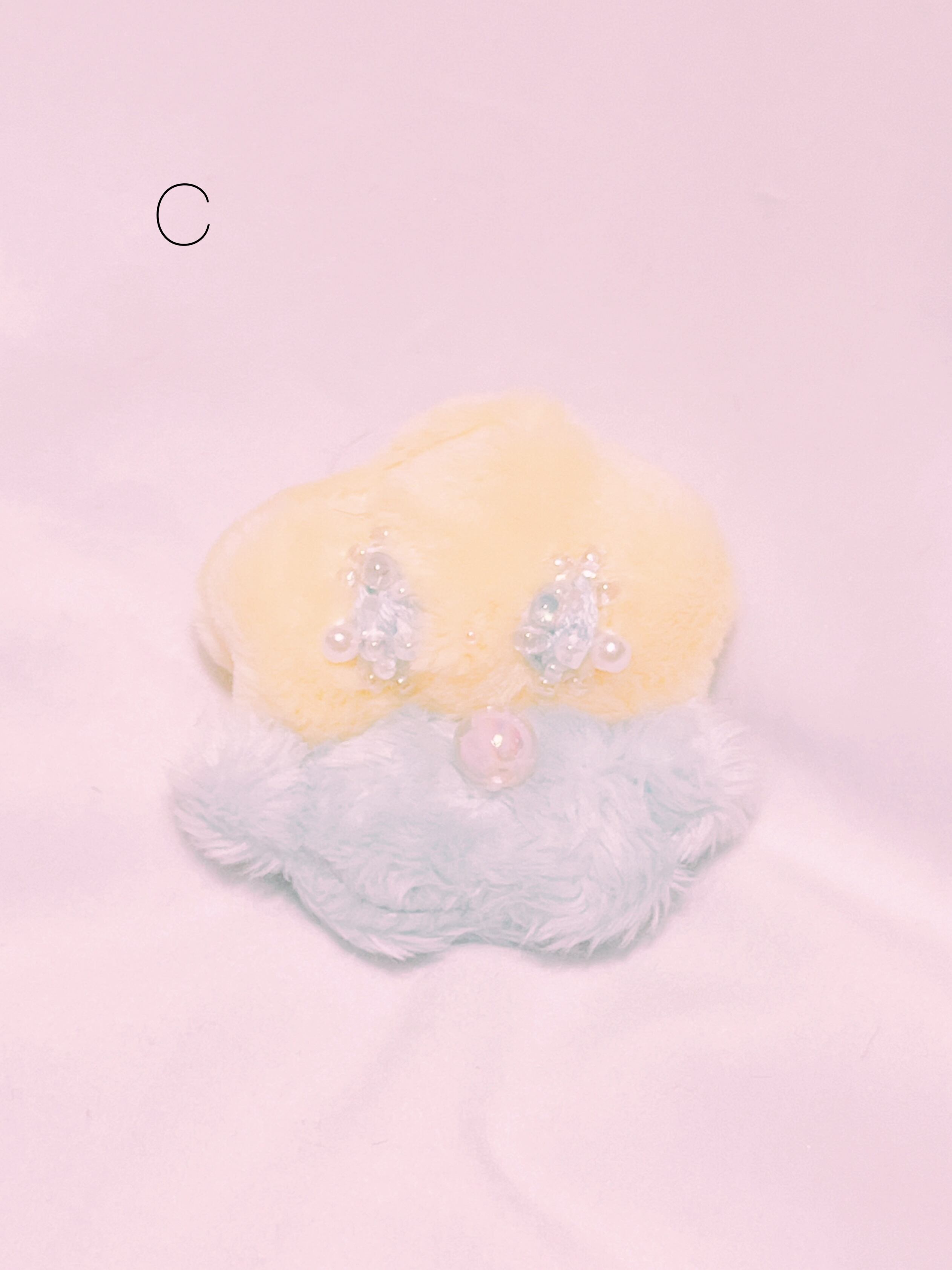 目がキラキラ、ビーズと刺繍でできています。目からはキラリとビーズの涙が光っています。